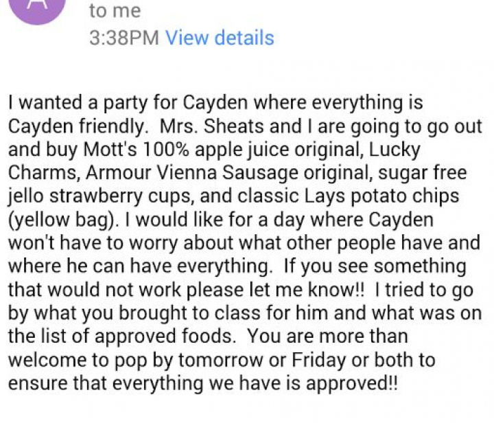 La fiesta fue todo un éxito. Cayden pudo comer de todo sin miedo y esta madre lloró de felicidad ante la generosidad y la consideración de la profesora de su hijo. Ha hecho de esta fiesta un momento memorable y ha dejado el listón muy alto para sus futuros profesores.
