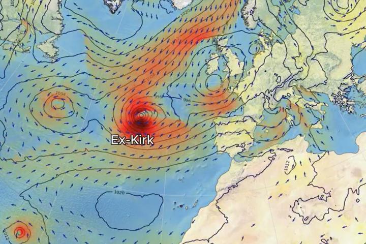 Con todos estos condicionantes, se espera que Kirk entre en España entre el martes y miércoles, dejando un gran temporal atlántico fuerte en el litoral gallego y cantábrico, y lo hará con vientos particularmente fuertes en amplias zonas del país, provocando "huracanadas locales" y precipitaciones generalizadas en el norte del país.