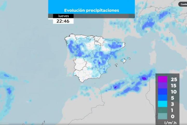 Durante la jornada de hoy, se prevé que haya lluvias localmente fuertes y acompañadas de tormenta y granizo en el tercio este, las Mesetas y Galicia. Con menor probabilidad y de forma menos pronunciada se darán en los litorales atlánticos y en el cuadrante sudoeste. Mientras que en Canarias se espera que haya intervalos nubosos con lluvias débiles y dispersas en las islas montañosas.