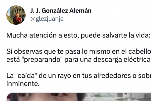 Al ver esto, el experto ha avisado: Mucha atención a esto, puede salvarte la vida. Si observas que te pasa lo mismo en el cabello es porque la atmósfera se está "preparando" para una descarga eléctrica. La 'caída' de un rayo en tus alrededores o sobre ti es muy probable e inminente".