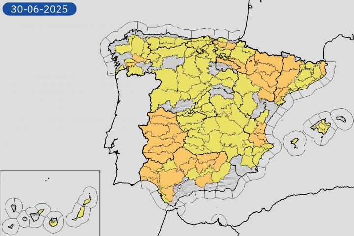 La alerta por calor es de nivel naranja en Andalucía, Aragón, Cataluña, Extremadura, Galicia, Navarra, País Vasco, La Rioja, Comunidad Valenciana, mientras que se activará el nivel amarillo por este mismo fenómeno en Islas Canarias, concretamente en Gran Canaria, Asturias, Baleares, Cantabria, Castilla y León, Castilla-La Mancha, Madrid y Murcia.