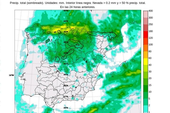 También se darán nevadas en montañas de la mitad norte peninsular y en el este de la meseta Norte, con posibles nevadas en las montañas del sureste. Además, es probable que haya acumulados significativos en el sistema Ibérico, este del Central y Cordillera Cantábrica. Tampoco se descartan en el este de la meseta Norte.