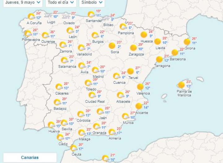 En el archipiélago canario también se apreciará un aumento en los valores, alcanzando temperaturas de hasta 29 grados en Santa Cruz o Lanzarote. Esta situación también se extenderá en las Baleares, aunque con temperaturas algo más suaves que en el resto peninsular, pudiendo alcanzarse 25 grados de máxima en Mallorca.