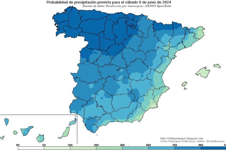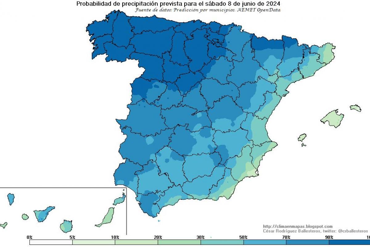 Las precipitaciones serán menos probables en el tercio oriental peninsular, mientras que no se esperan en Baleares ni en el litoral mediterráneo oriental. Y en Canarias habrá intervalos nubosos, con posibilidad de alguna precipitación débil y chubascos ocasionales en las islas con mayor relieve.