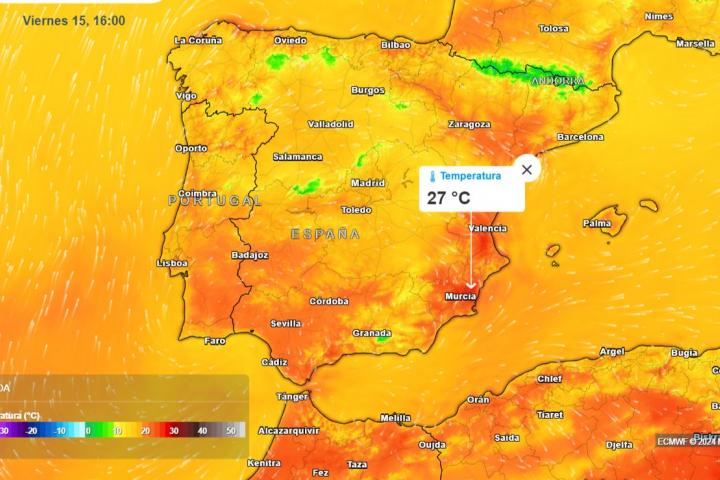 Pero el día más cálido de la semana será el viernres con temperaturas máximas entre los 20 y los 22 grados en buena parte del sur, oeste, área mediterránea, ambos archipiélagos y valle del Ebro. También verán los 20 grados o más en el interior de Galicia y en todas las comunidades cantábricas. El ambiente se presenta cálido en la Comunidad Valenciana y Región de Murcia, con máximas entre 24 y 26 grados, donde ee forma local pueden llegarse a 27 o incluso 28 grados.