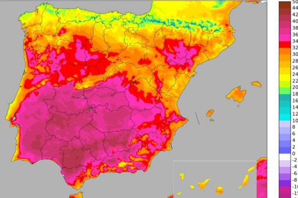 Apenas el litoral mediterráneo y parte del tercio norte peninsular escaparán de los inquietantes tonos morado o rojo intenso que adelanta un fuerte ascenso térmico.