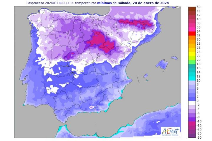 Se han activado alertas naranjas por temperaturas mínimas en la Ibérica zaragozana, Ibérica de Soria, Meseta de Soria y Sistema Central de Soria. Las amarillas se localizan en Ávila, Segovia, León, Palencia, Burgos, Huesca, Lleida, Girona, Navarra y A Coruña.