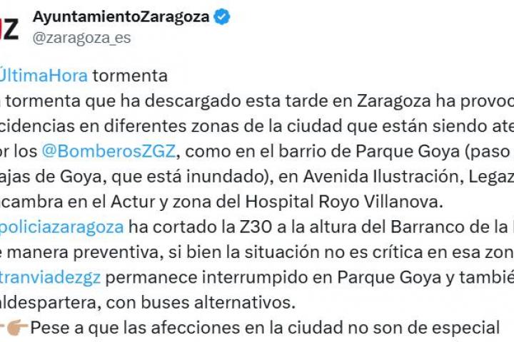 Hasta esa hora, los Bomberos de Zaragoza han atendido más de 30 salidas relacionadas con la tormenta, incluidos algunos rescates en vehículos en puntos inundados.