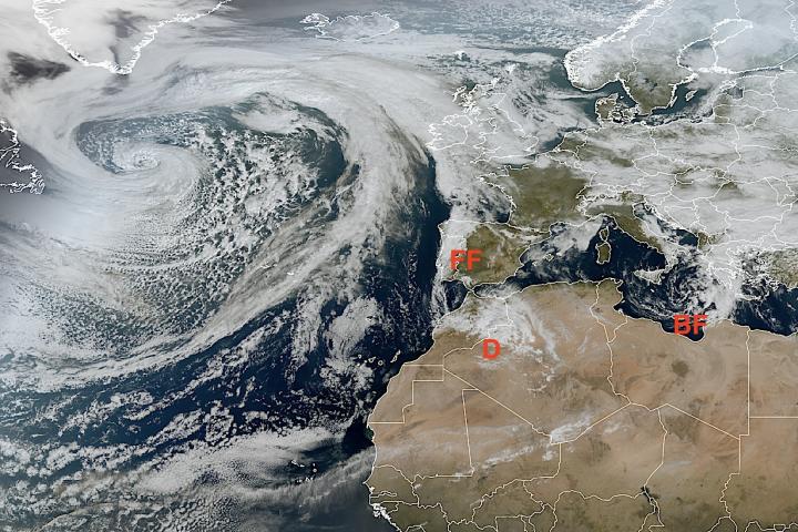 El meteorólogo Ángel Rivera, que trabajó hasta hace algo más de una década en el INM-AEMET, ha explicado que "un frente frío (FF) se mueve lentamente por el oeste de Iberia, mientras que una DANA (D) -con una ligera circulación en superficie- discurre desde el golfo de Cádiz hacia Marruecos y Argelia produciendo algunas precipitaciones".