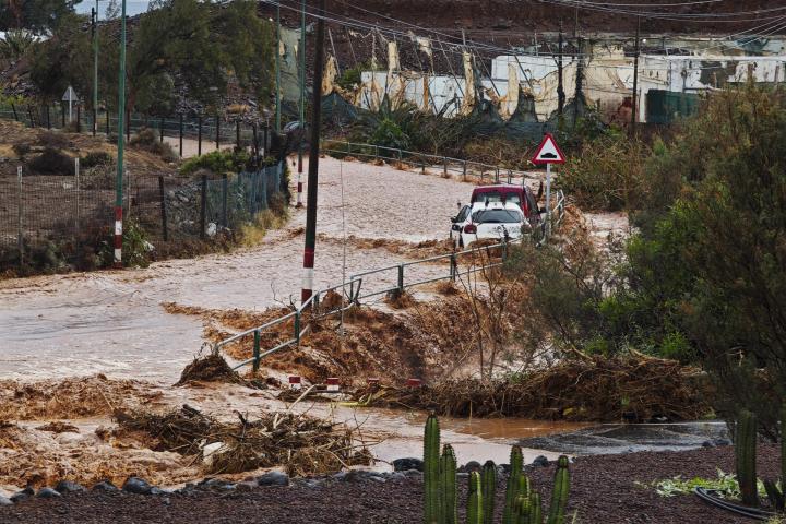 Barrancos desbordados, coches en el mar y viviendas anegadas en Canarias