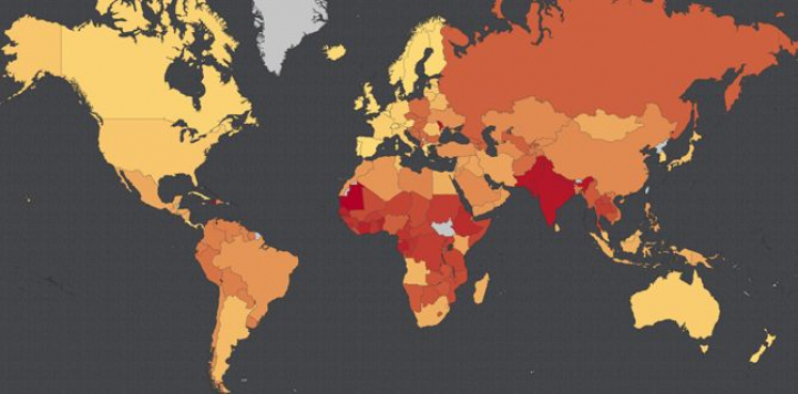 En el mapa que aparece más arriba, de la Walk Free Foundation, se usan colores rojos para señalar los lugares con mayor presencia de esclavitud, y los amarillos claros para representar una menor tasa de esclavitud. Para elaborarlo, se ha tenido en cuenta la prevalencia de la esclavitud moderna en la población, el matrimonio infantil y la trata de personas.