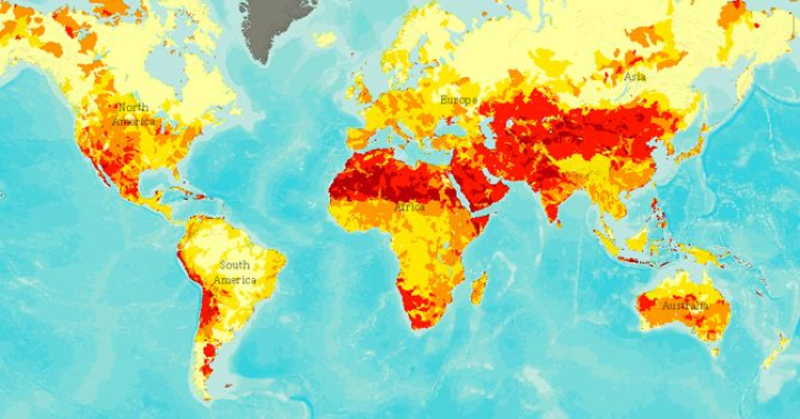 Cuando hablamos de una crisis mundial del agua, lo hacemos totalmente en serio. El World Resource Institute utiliza una herramienta de mapeo llamada Aqueduct para hacer entender a empresas, inversores, gobiernos y público en general los riesgos de la crisis mundial del agua. ¿Te das cuenta de las semejanzas con el mapa anterior? Aunque la agricultura tiene su oportunidad en el África subsahariana, el norte y algunas partes del sur se enfrentan a una preocupante escasez de agua.
