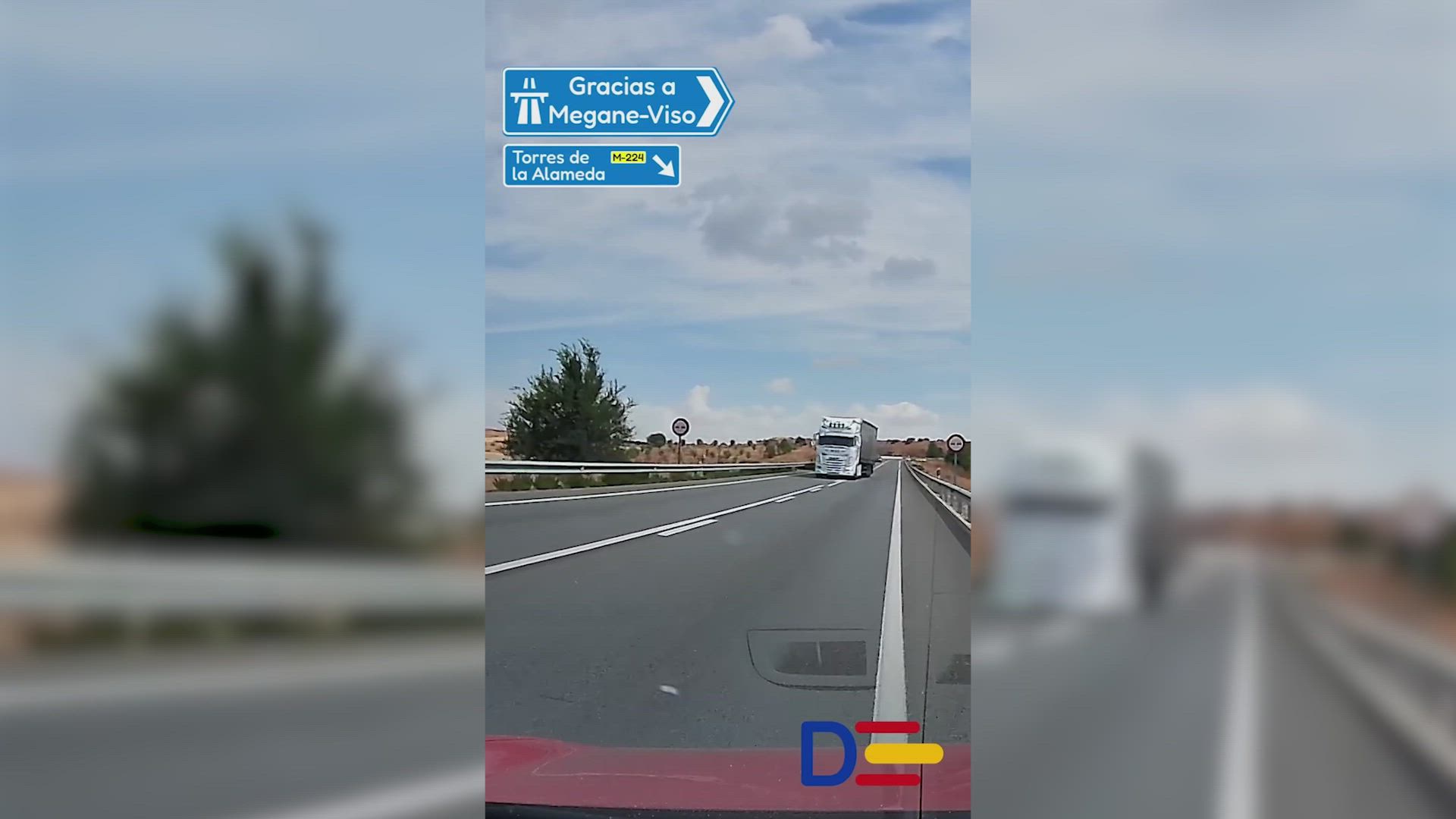 Un conductor ha conseguido grabar uno de los adelantamientos más peligrosos que se recuerdan en las carreteras españolas. El imprudente acto ha tenido lugar autovía de Torres de la Alameda (Madrid): Un camión adelanta de forma totalmente temeraria a otro en una carretera de un solo carril por sentido y obliga a los turismos que van en sentido contrario a esquivarlo.