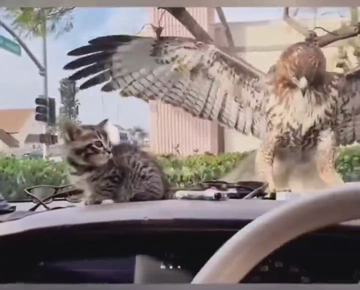 Este vídeo se ha hecho viral por la singularidad de sus imágenes. Consiste en un halcón que al ver a una cría de gato (una presa fácil) no duda en ir a cazarla, pero lo sorprendente es que este gato estaba dentro de un coche, imposibilitando al halcón así su intento de caza.