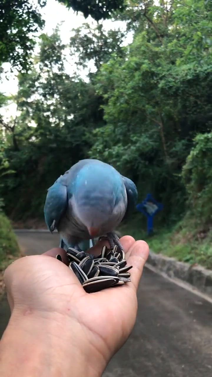El mágico momento de un pájaro vuela directo a la mano de una mujer llena de pipas