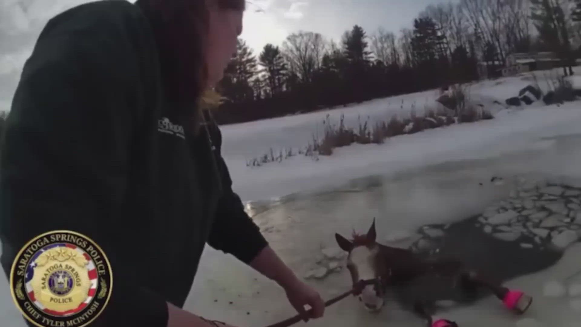El tenso rescate de un caballo que cae a un lago helado
