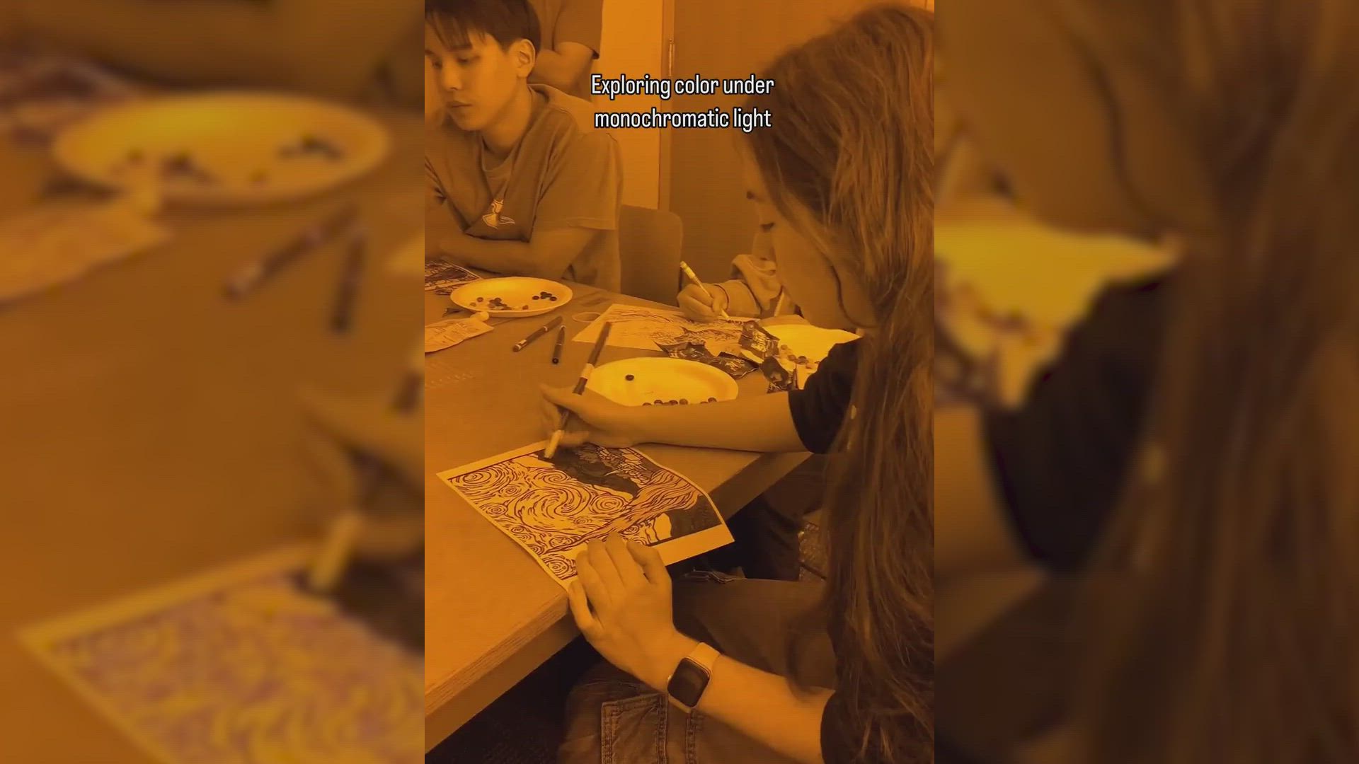 Este grupo de amigos hicieron el experimento de dibujar "sin colores", con una luz monocromática donde se podía apreciar una escala de marrones y amarillos, sin saber exactamente qué color estaban usando en cada momento. Al encender las luces y ver como es habitual se dieron cuenta del resultado de sus dibujos.