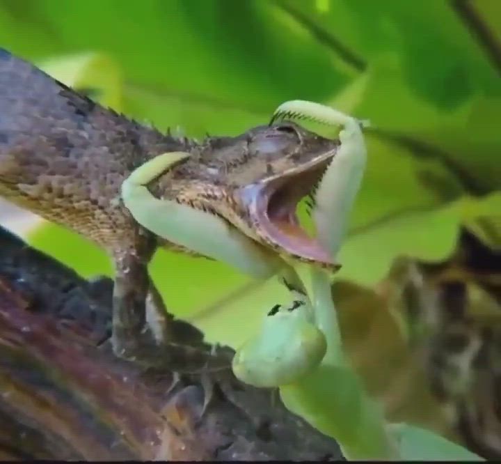 Una mantis religiosa y un lagarto luchan por sobrevivir. Cuando parece que el reptil ha ganado la batalla, la mantis reacciona mordiéndole y finalmente gana la cruda lucha