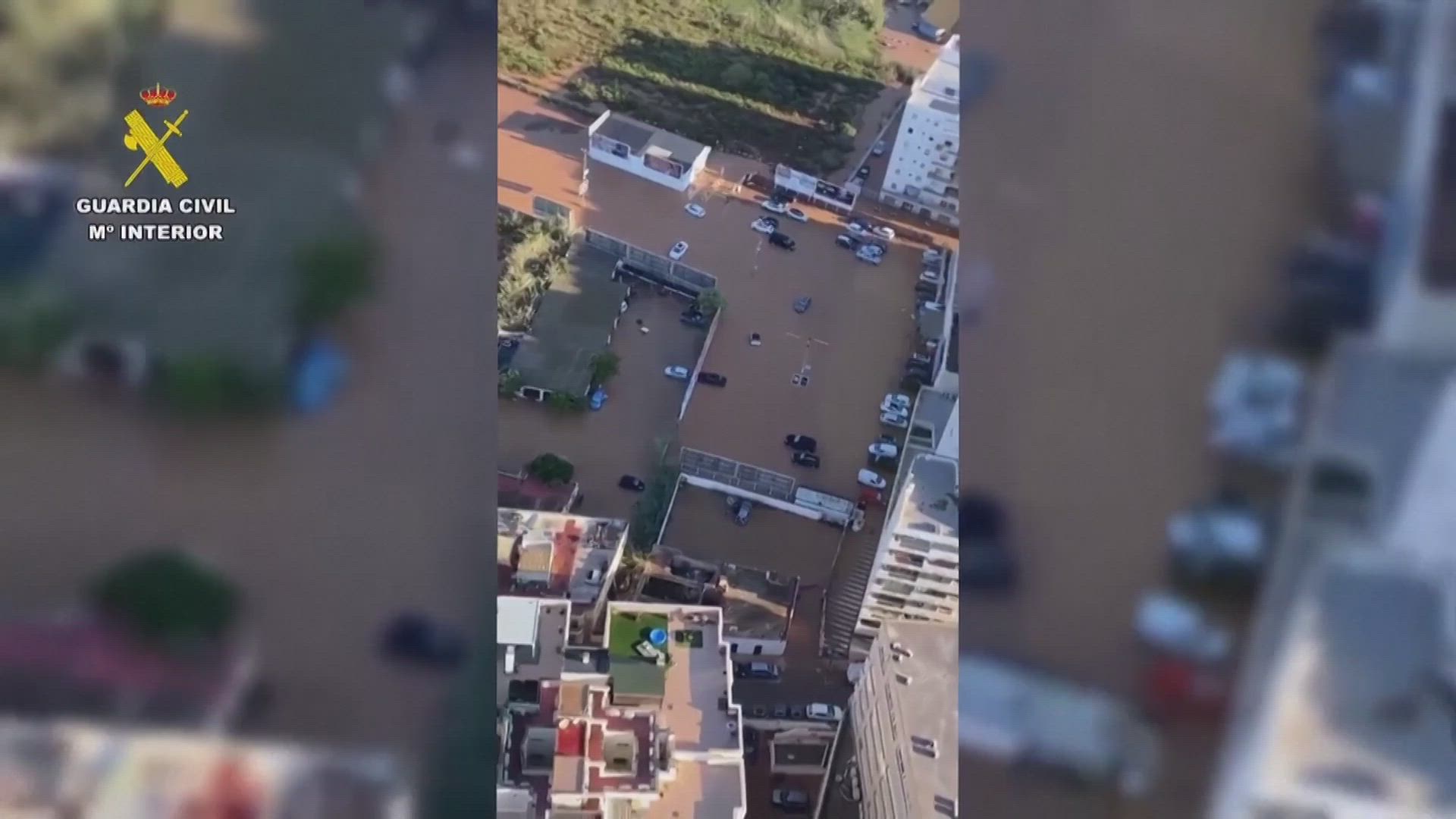 Estas imágenes aéreas compartidas por la Guardia Civil muestran el impacto de las lluvias récord provocadas por la tormenta Gabrielle en Ibiza, España. La Guardia Civil española rescató a 148 personas tras las lluvias torrenciales, según informó la policía el miércoles.