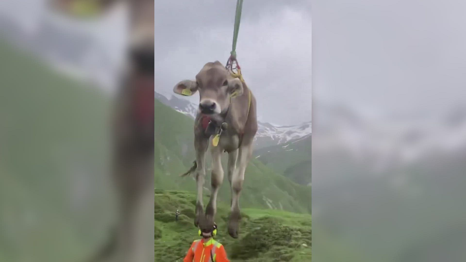 Una vaca se queda atrapada en lo alto de una montaña y los bomberos la rescatan de la forma más efectiva pero que el animal jamás podrá olvidar. La atan a un helicóptero y la vaca sobrevuela el cielo como si le hubieran salido alas.
