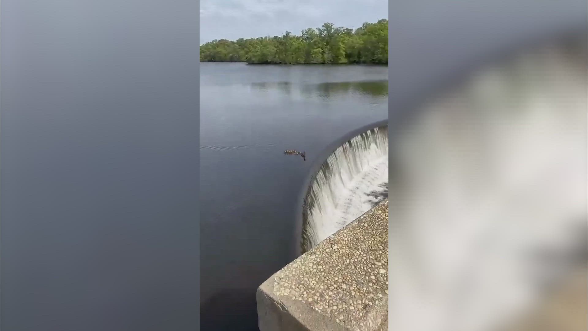 Una familia de patos con su madre a la cabeza nadan en lo alto de un estanque con agua corriente que poco a poco los arrastra hacia una alta cascada. Una de las crías no puede mantenerse arriba y termina cayéndose. La reacción de mamá pato y del resto de los patitos encoge el corazón.