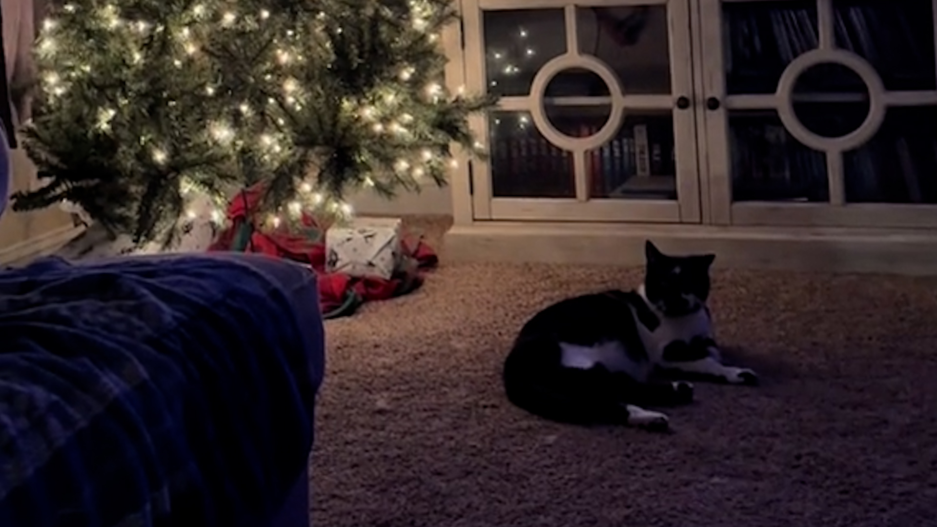 Se relajan con el gato junto al árbol de Navidad hasta que se dan cuenta de que algo no va bien