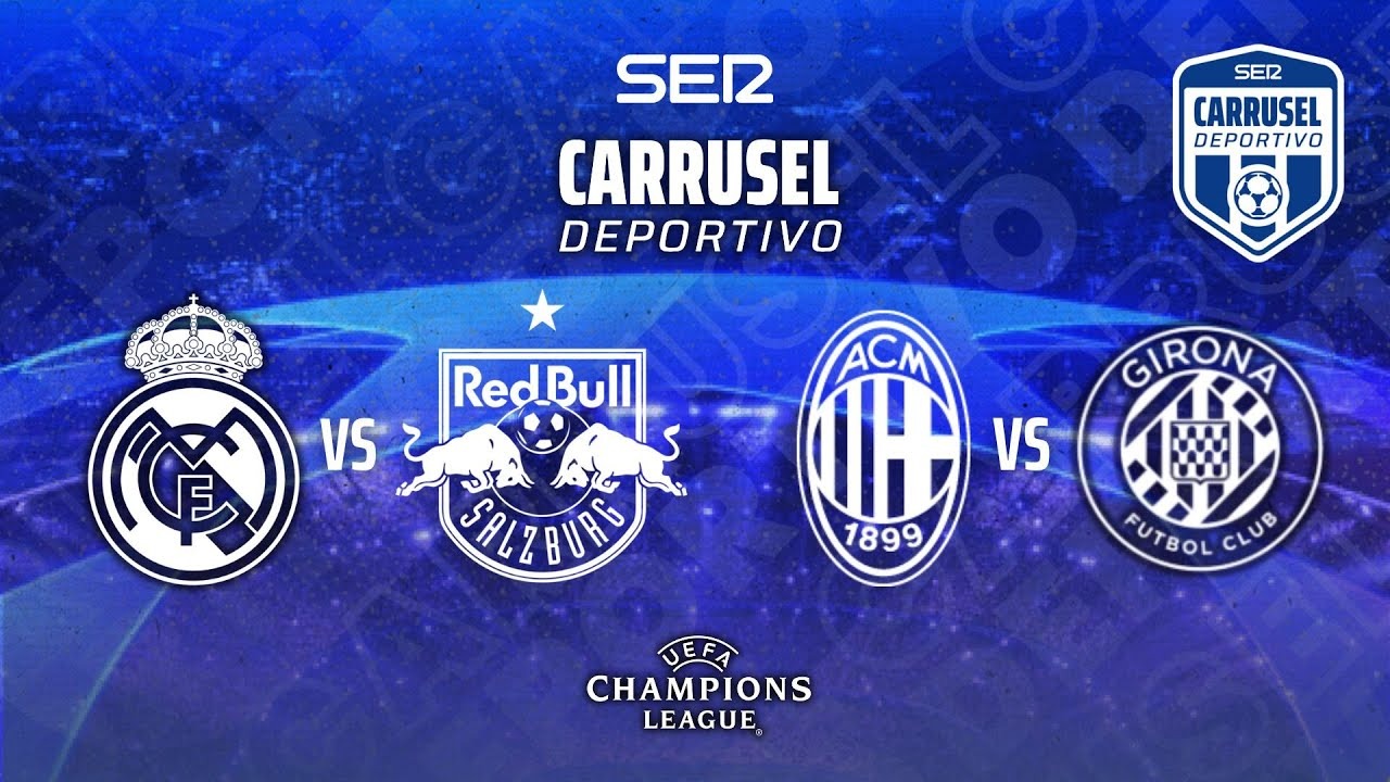 Escucha y mira EN DIRECTO el Real Madrid - RB Salzburgo y AC Milan - Girona FC de la Jornada 7 de la liguilla de la UEFA Champions League con Dani Garrido, la narración de Antonio Romero, Nuria Vilamala y todo el equipo de Carrusel Deportivo.