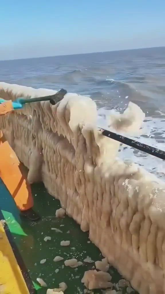 Un barco cubierto de hielo en océanos congelados crea un paisaje surrealista