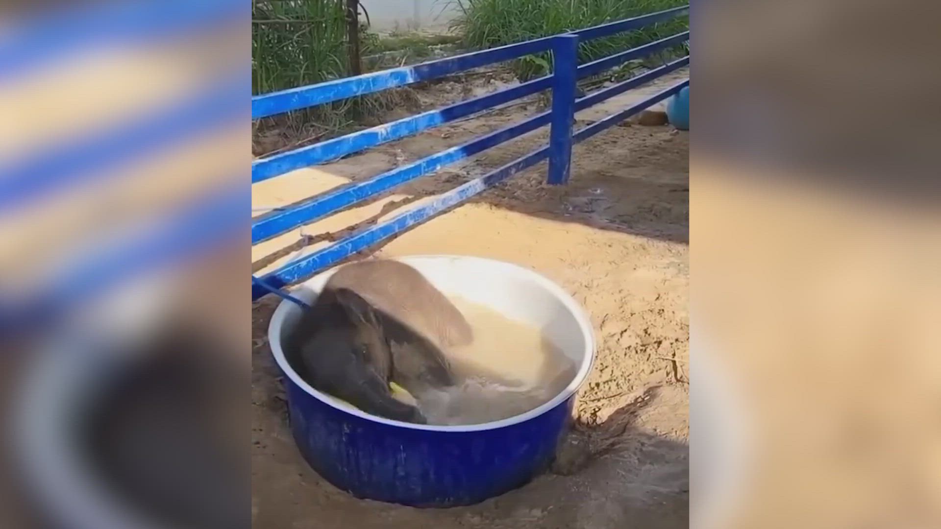 Un bebé elefante que odia el agua se atreve a darse un chapuzón gracias a su nuevo mejor amigo