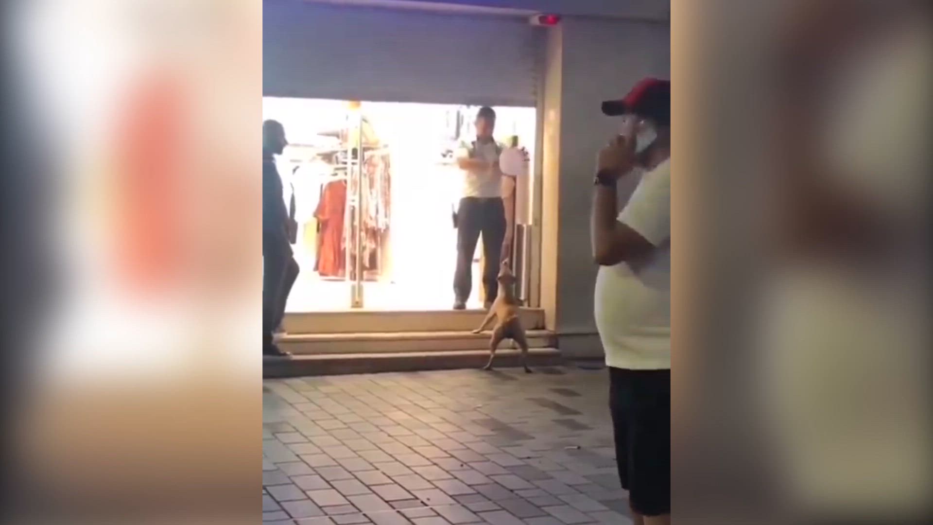 Un guardia de seguridad infla un globo para que juegue un perro y su reacción te alegrará el día