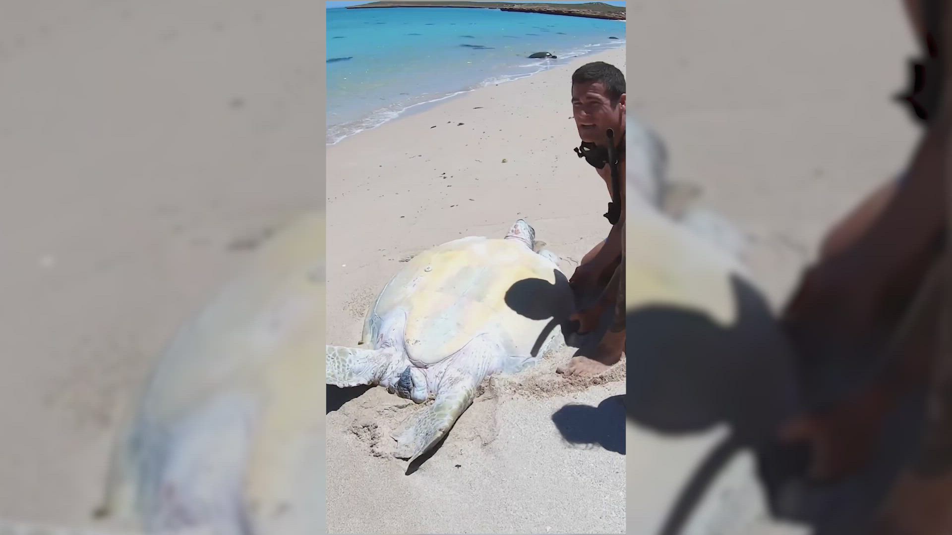 Una gigantesca tortuga queda atrapada en la arena de la playa y un padre acude a todo correr para convertirse en héroe salvador