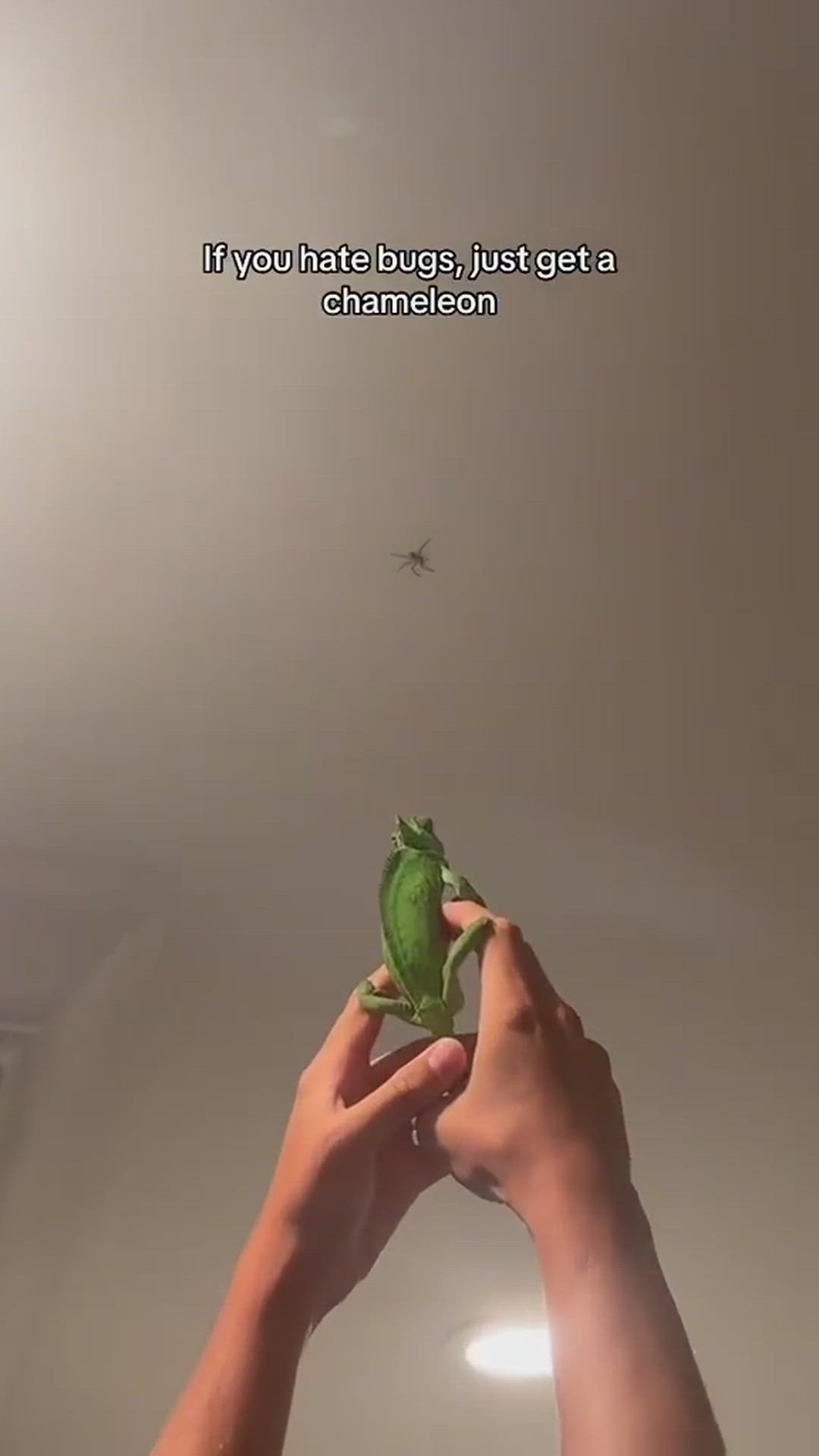 Utiliza un camaleón para cazar una enorme araña que aparece en su techo