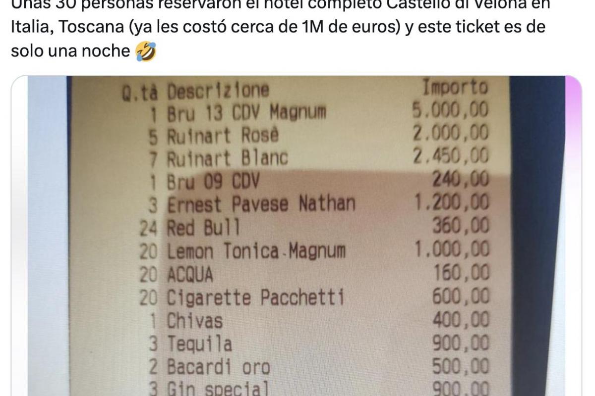"Unas 30 personas reservaron el hotel completo Castelló di Velona en Italia, Toscana (ya les costó cerca de 1M de euros) y este ticket es de solo una noche", ha publicado la cuenta dedicada a la hostelería en la red social de Elon Musk.