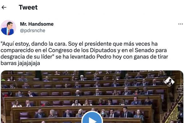 Esta escena, que dura 36 segundos, está dando que hablar en Twitter y supera ya los 1.100 'me gusta' en pocas horas. "'Aquí estoy, dando la cara. Soy el presidente que más veces ha comparecido en el Congreso de los Diputados y en el Senado para desgracia de su líder' se ha levantado Pedro hoy con ganas de tirar barras jajajajaja", ha escrito Mr. Handsome en Twitter junto al momento.