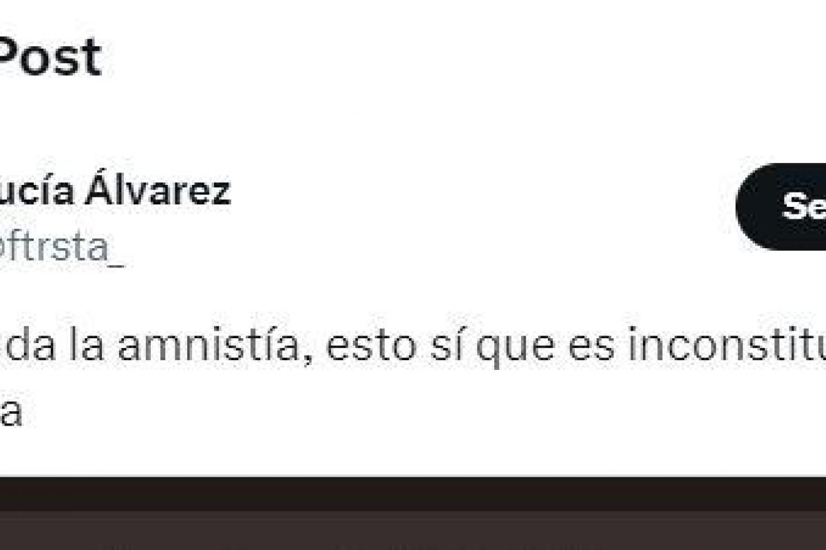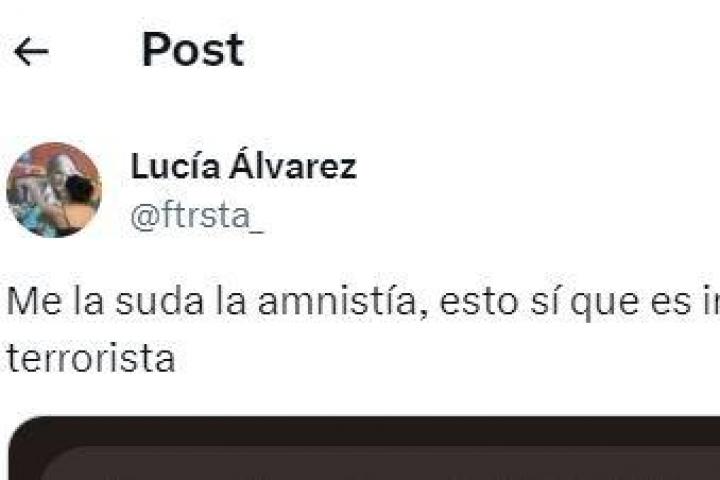 "Me la suda la amnistía. Esto sí que es inconstitucional y terrorista", ha escrito la joven muy molesta en un tuit que ha recibido más de 7.000 'me gusta' y 2.000 retuits.