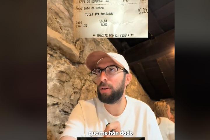 "Es el ticket más lioso que me han dado en un restaurante. Me cobraron el agua, me metieron el agua", señala mientras su compañero le enseña que en el menú figuraba el mensaje "pan, agua, copa de vino o cerveza". Que aparezca la "o" y no la "y" lo cambia todo. Es decir, de esas cuatro cosas hay que elegir una y entre esas opciones meten también el pan, que es algo poquísimas veces visto.