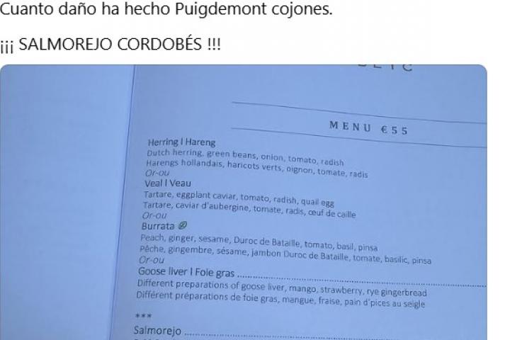 "Sopa catalana de vegetales fría. Huevos mimosa", se puede leer en esa descripción. "Estoy ya arreglando con el Capitán Alatriste para volver a poner otra pica en Flandes. Concretamente en to la toroa del chef del restaurante ese. Cuanto daño ha hecho Puigdemont cojones. ¡¡¡ SALMOREJO CORDOBÉS !!!", ha escrito el usuario junto a la carta.