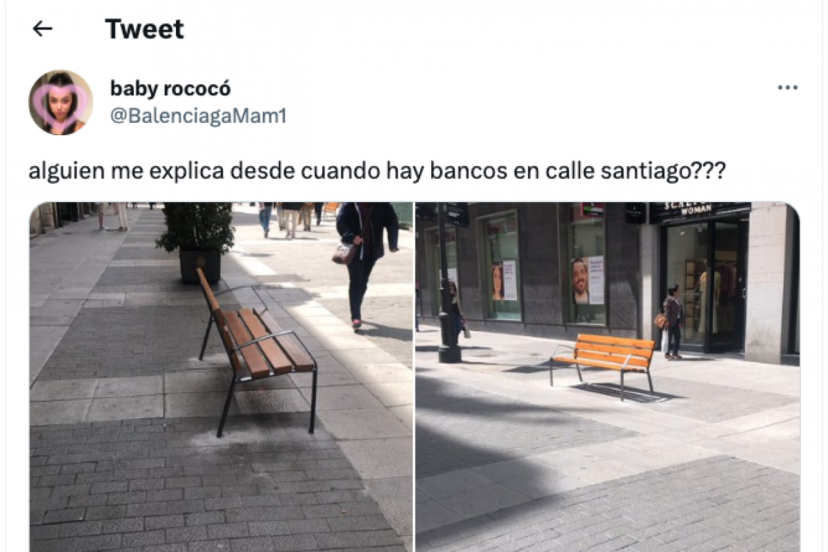"¿¿Alguien me explica desde cuándo hay bancos en calle Santiago???", preguntó la usuaria en Twitter, sin citar en ningún momento al alcalde en la red social.