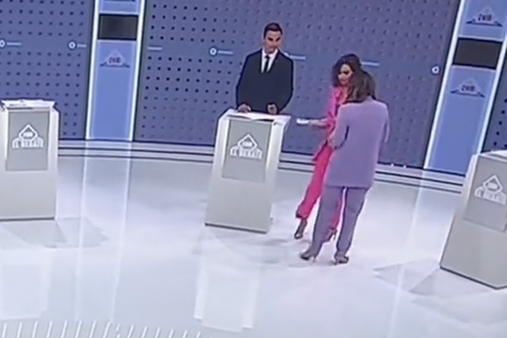 Momento de gran tensión entre la presidenta de la Comunidad de Madrid, Isabel Díaz Ayuso, y la candidata de Podemos, Alejandra Jacinto, a cuenta de los más 7.000 ancianos fallecidos en las residencias durante la pandemia.