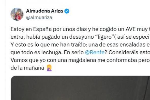 Almudena Ariza pide un desayuno ligero en un AVE y no da crédito a lo que le traen