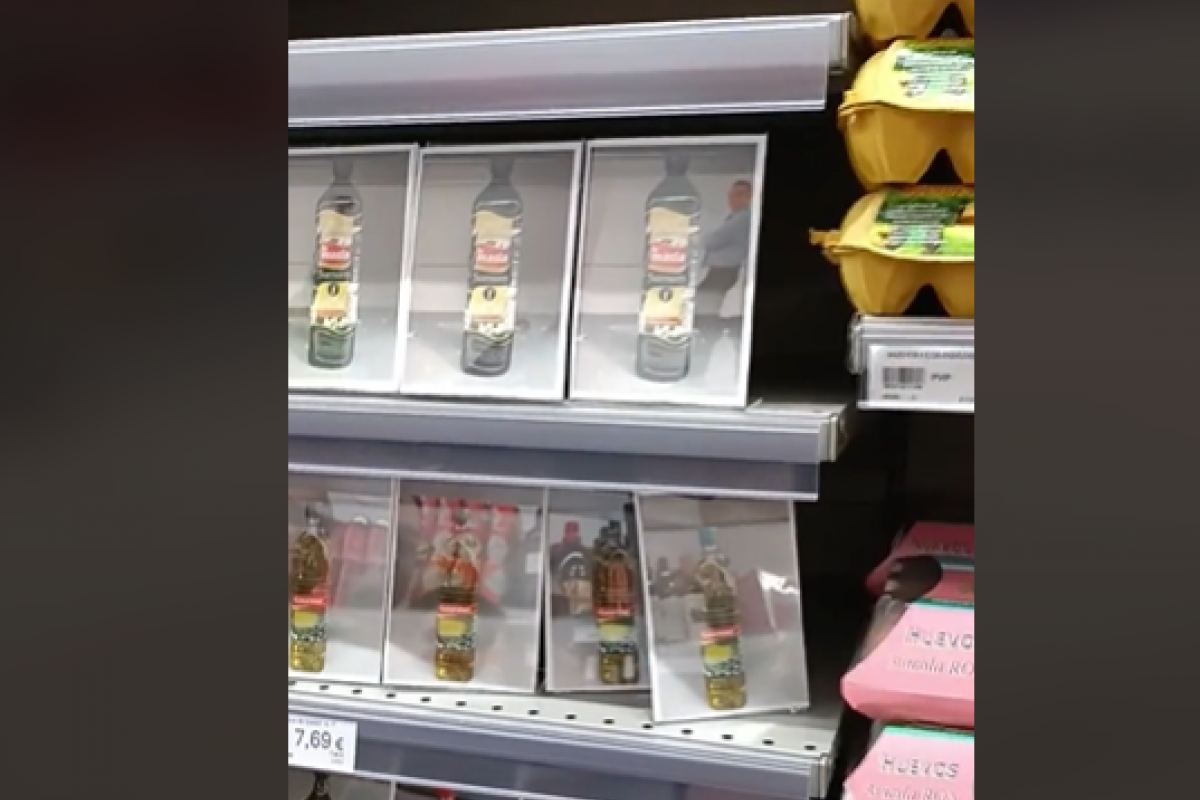 La usuaria de TikTok @maarvid08 ha alucinado por lo que se ha encontrado en un supermercado de Sevilla en las estanterías del aceite de oliva. El aumento del precio de las botellas ha provocado robos de aceite en algunos supermercados y este en concreto ha preferido prevenir antes que curar.