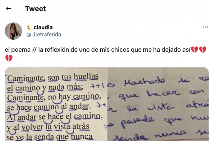 La docente ha publicado la interpretación y el comentario que uno de sus alumnos hizo al conocido poema Caminante no hay camino, de Antonio Machado. "El poema // la reflexión de uno de mis chicos que me ha dejado así💔💔💔", ha escrito la maestra, cuyo mensaje acumula más de 3.000 'me gusta' en un solo día.