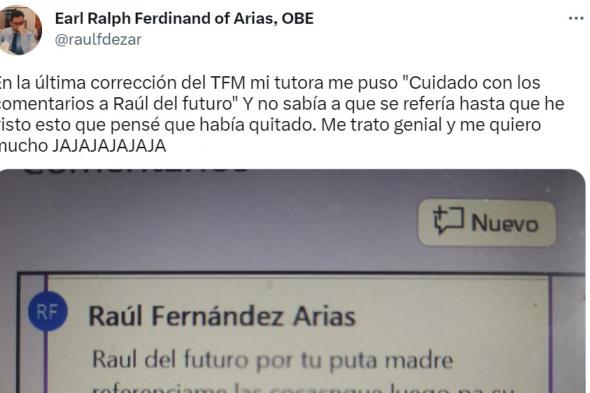 Además, Fernández ha compartido también la imagen del trabajo en la que se puede ver la anotación que se hizo y que se le olvidó borrar: "Raúl del futuro por tu puta madre referénciame las cosas que luego pa su puta madre".