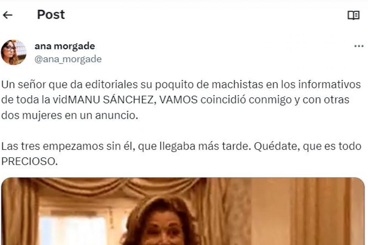"Un señor que da editoriales un poquito de machistas en los informativos de toda la vidMANU SÁNCHEZ, VAMOS coincidió conmigo y con otras dos mujeres en un anuncio", ha empezado contando Morgade.