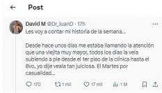 "Ahora entiendo el desmantelamiento de la sanidad pública. Nos vamos a morir igual", ha escrito Alonso, logrando una importante repercusión en la red social de Elon Musk. El mensaje supera los 4.000 'me gusta' en menos de 24 horas y un alcance de casi 100.000 personas.