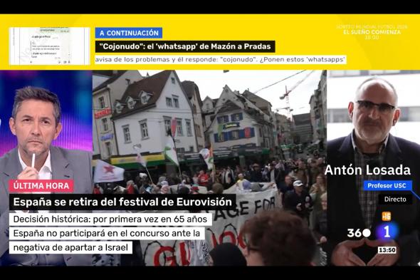 Antón Losada ha estado este viernes en Mañaneros 360 para analizar la última hora política de nuestro país. Durante la conexión en directo, Javier Ruiz le ha preguntado por un tema de plena actualidad: la salida de España del festival de Eurovisión. Y el analista gallego no ha podido ser más claro.