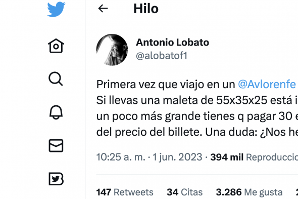 Antonio Lobato cuenta lo que le pasado al usar AVLO por primera vez y lo remata con un tuit de diez
