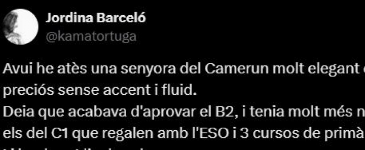 La usuaria de X Jordina Barceló (@kamatortuga) ha publicado un tuit hablando de la anécdota que le ha ocurrido con una mujer camerunesa a quien ha atendido en el trabajo, por su gran manejo de la lengua catalana y la reflexión que le ha dejado ella.