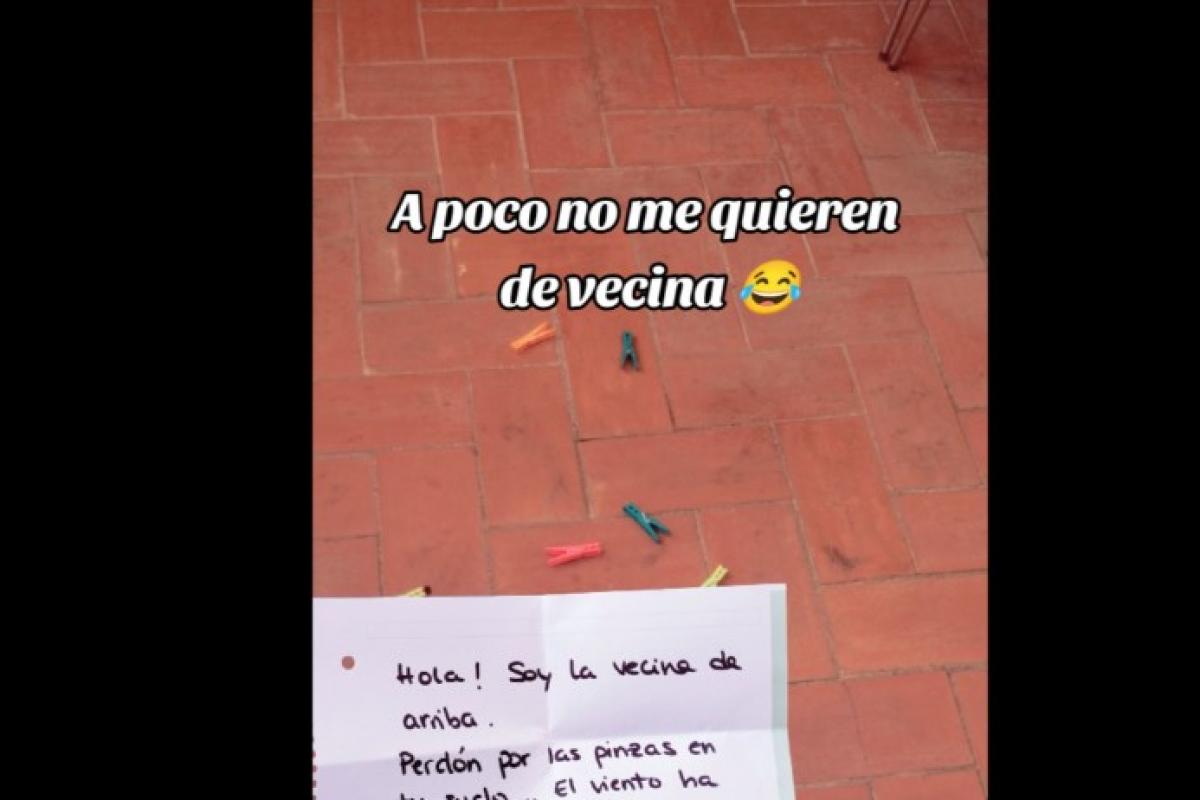 Lo primero que muestra es el escrito que le dejó su vecina: "¡Hola! Soy la vecina de arriba. Perdón por las pinzas en tu suelo... El viento ha tirado el tendedero y la cesta de las pinzas. ¡Disculpas las molestias!.
