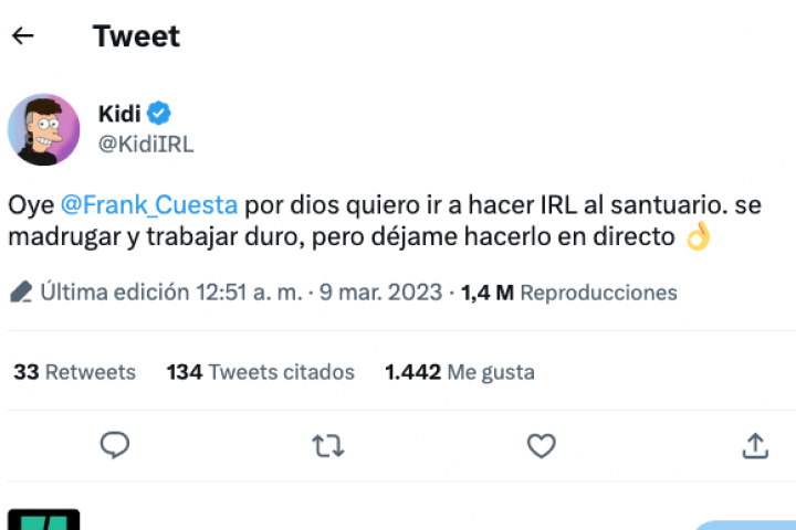 "Oye @Frank_Cuesta por dios quiero ir a hacer IRL al santuario. se madrugar y trabajar duro, pero déjame hacerlo en directo", ha escrito Kidi, que se ha encontrado la respuesta en la que Cuesta muestra sus condiciones.